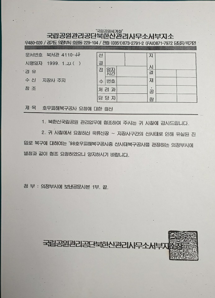 지장사(지장암)는 수해복구에 누락되었다는 북서관 4110-48를 국립공원 관리공단 북한산 관리사무소 서부지소로부터 1999년 1월 22일 받았으며 첨부로 국립공원 관리공단 북한산 관리사무소 서부지소에서 의정부시에 보낸 공문사본 1부(의정부시장 수신으로 제목 : 호우피해 복구공사 요청)