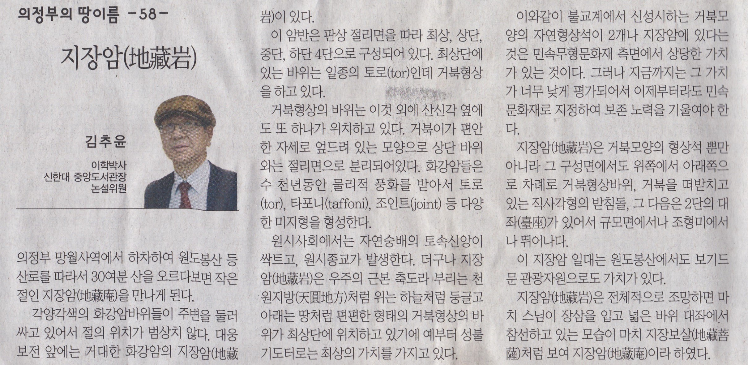 - 천혜의 수려한 경관을 나타내는 북한산 국립공원 해발 250m에 위치한 지장암(地藏岩)은 예로부터 영험한 바위로 신성시 여겨지고 있는 소중한 자연유산으로 그 가치가 매우 높아 인간이 인위적으로 조각하지 못하게끔 자연 그대로 보존하기 위해 관리하고 있음